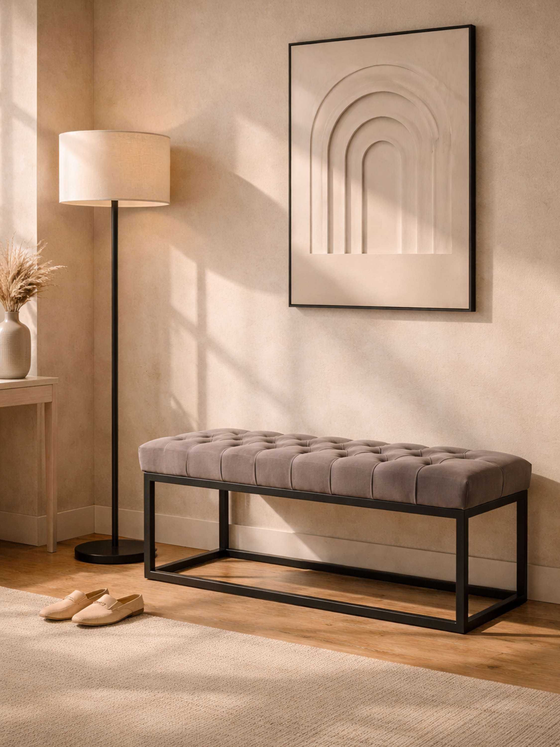 Ławka pikowana Industrialna Classic LOFT to elegancki mebel do przedpokoju, który łączy miękkie pikowane siedzisko z solidną metalową konstrukcją w stylu loft. Ręczne wykonanie i starannie dobrane materiały nadają meblowi dopracowany, rzemieślniczy charakter. To ławka, która wprowadza do wnętrza komfort, trwałość i ponadczasową prostotę formy.