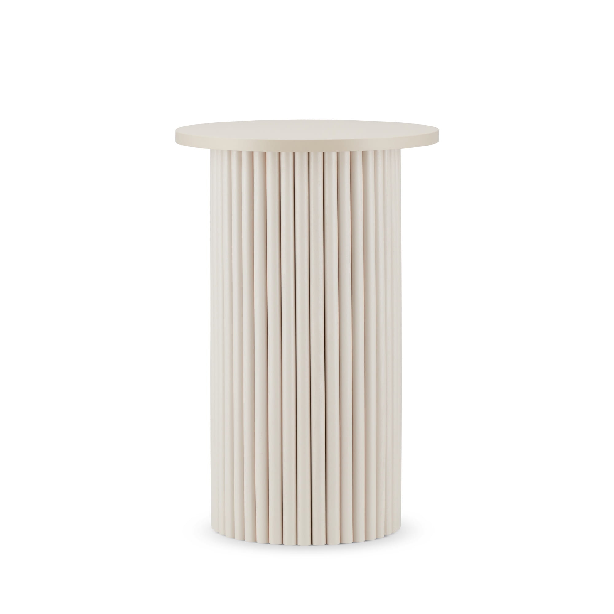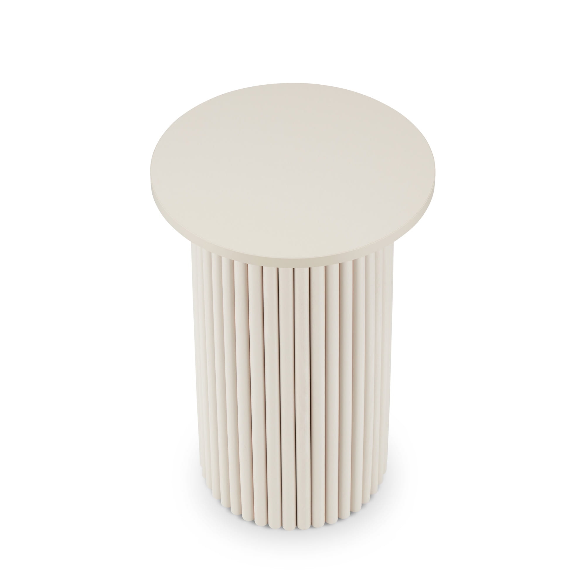 Okrągły blat w połączeniu z dekoracyjną ryflowaną nogą tworzy elegancką i nowoczesną formę, która dobrze komponuje się zarówno z minimalistycznymi, jak i bardziej klasycznymi aranżacjami wnętrz. Charakterystyczne pionowe ryflowanie nadaje podstawie subtelny, architektoniczny wygląd i sprawia, że mebel staje się dekoracyjnym elementem przestrzeni.