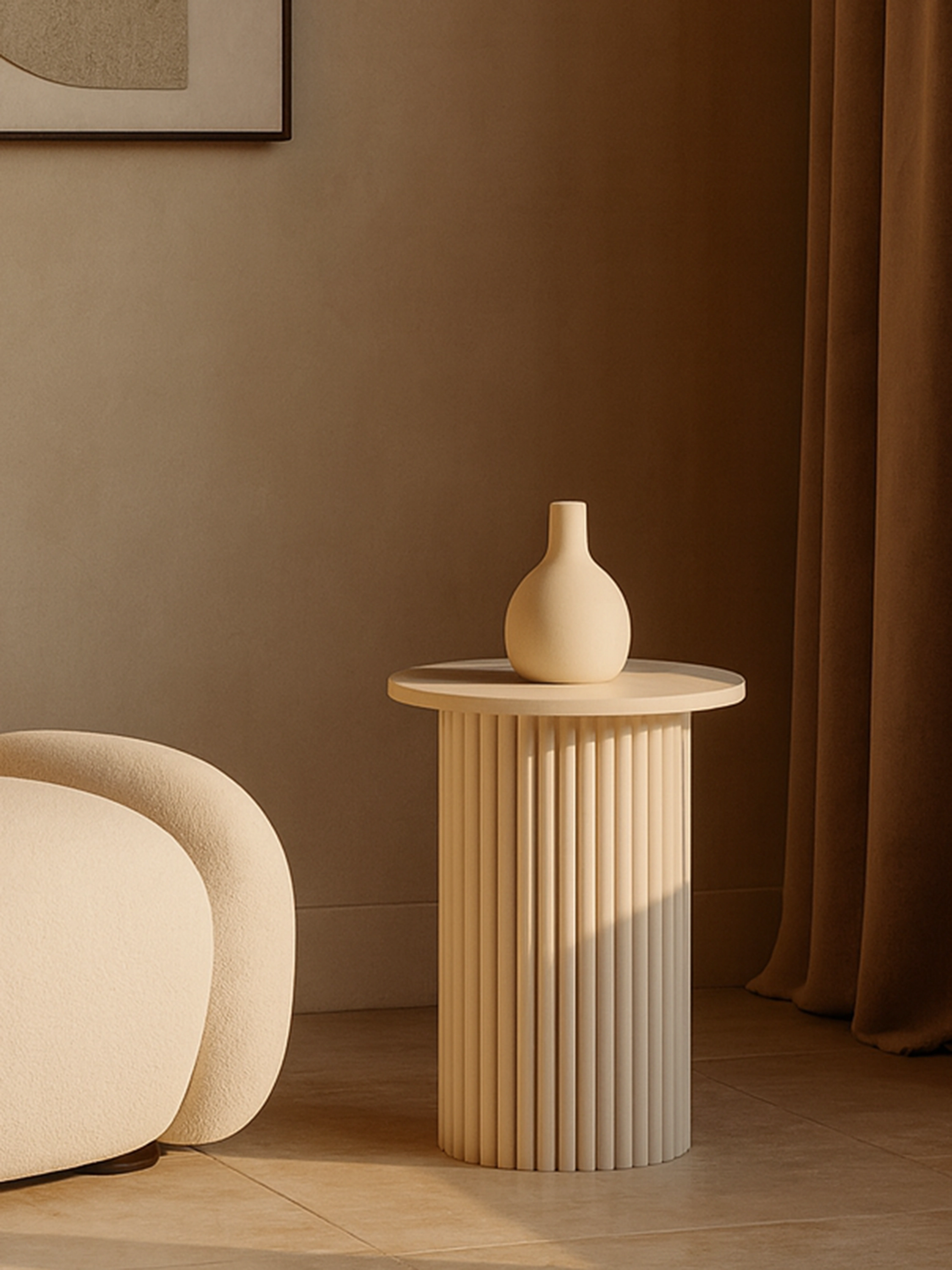 Stolik pomocniczy Grey Rythm – nowoczesna forma, dekoracyjna ryflowana podstawa i funkcjonalność w eleganckim wydaniu.