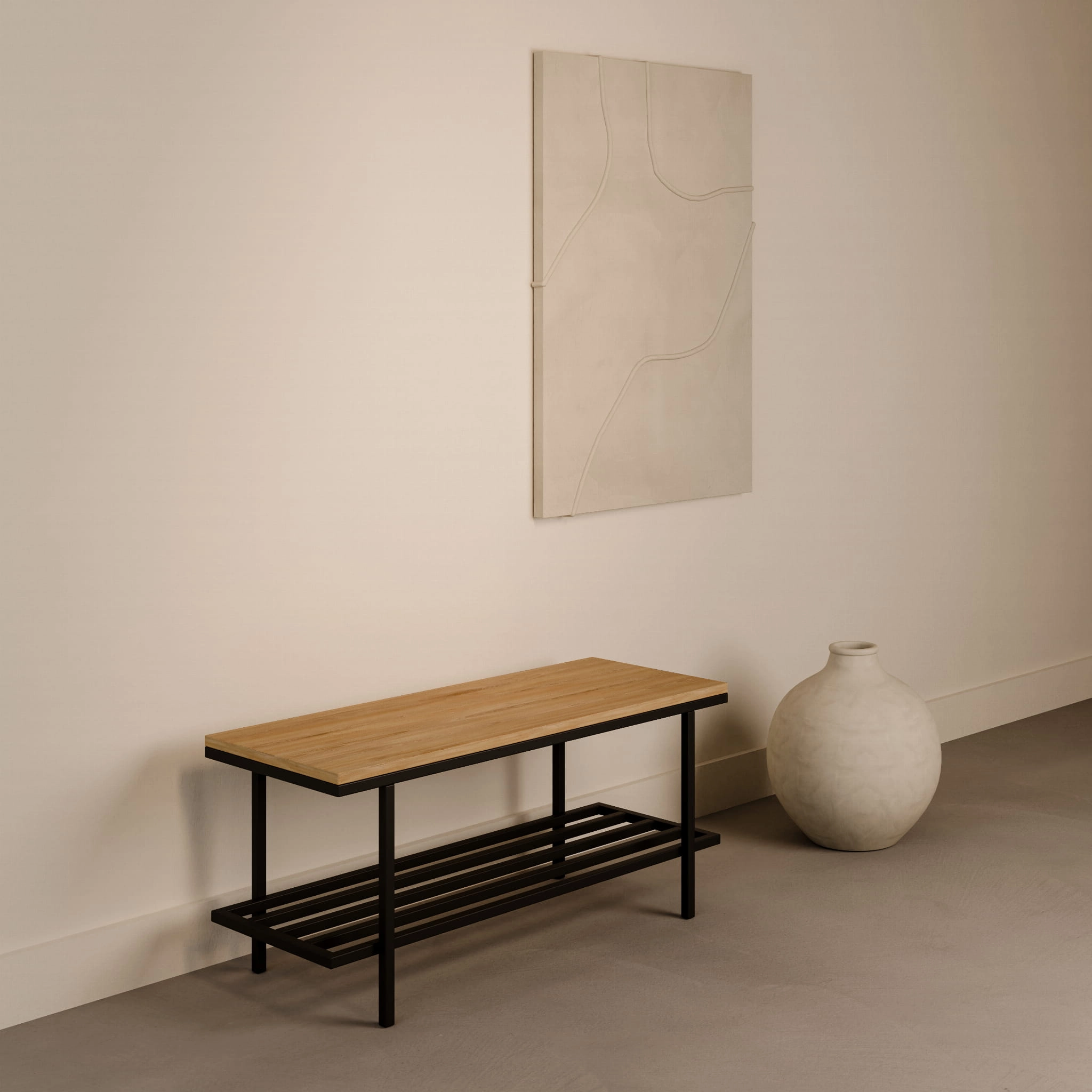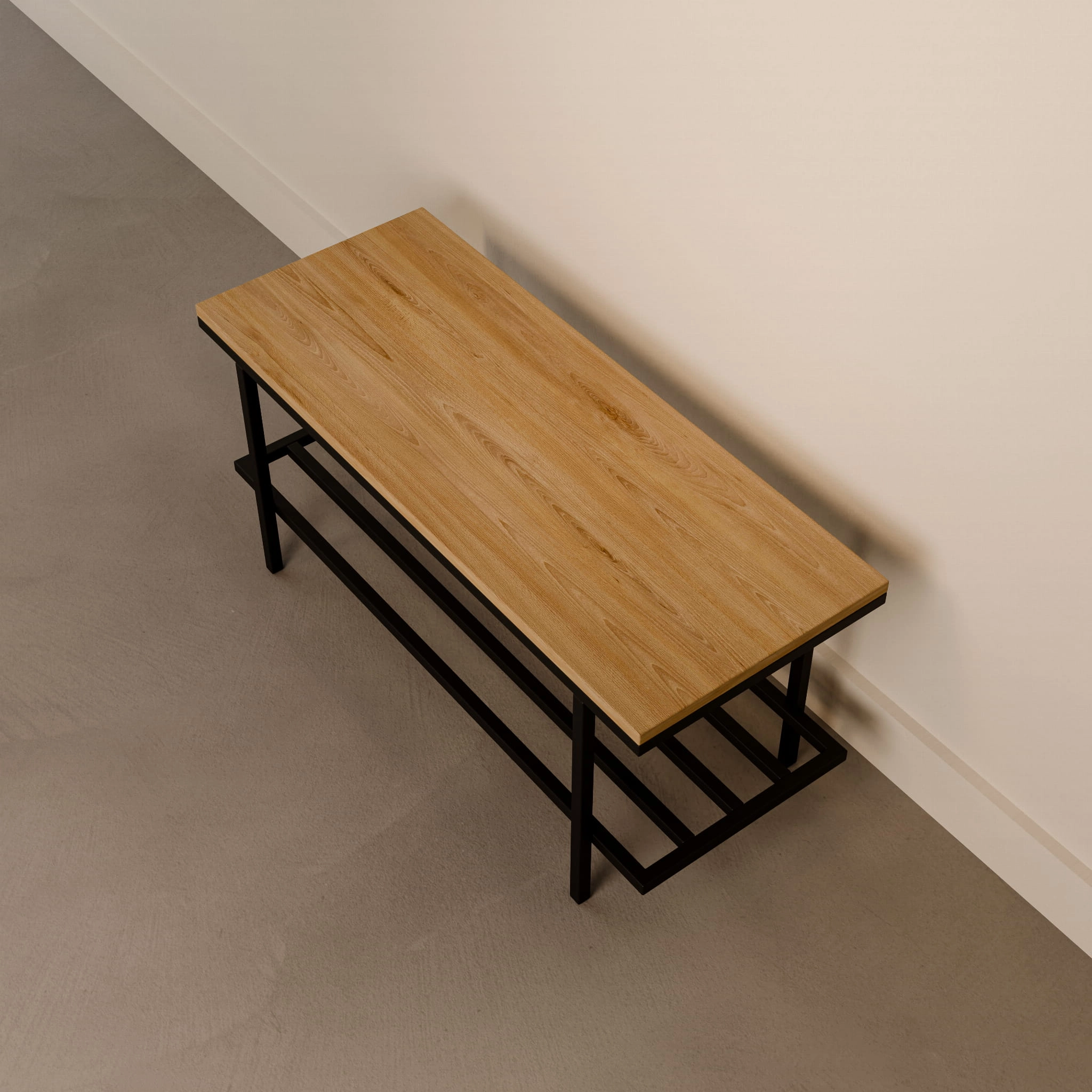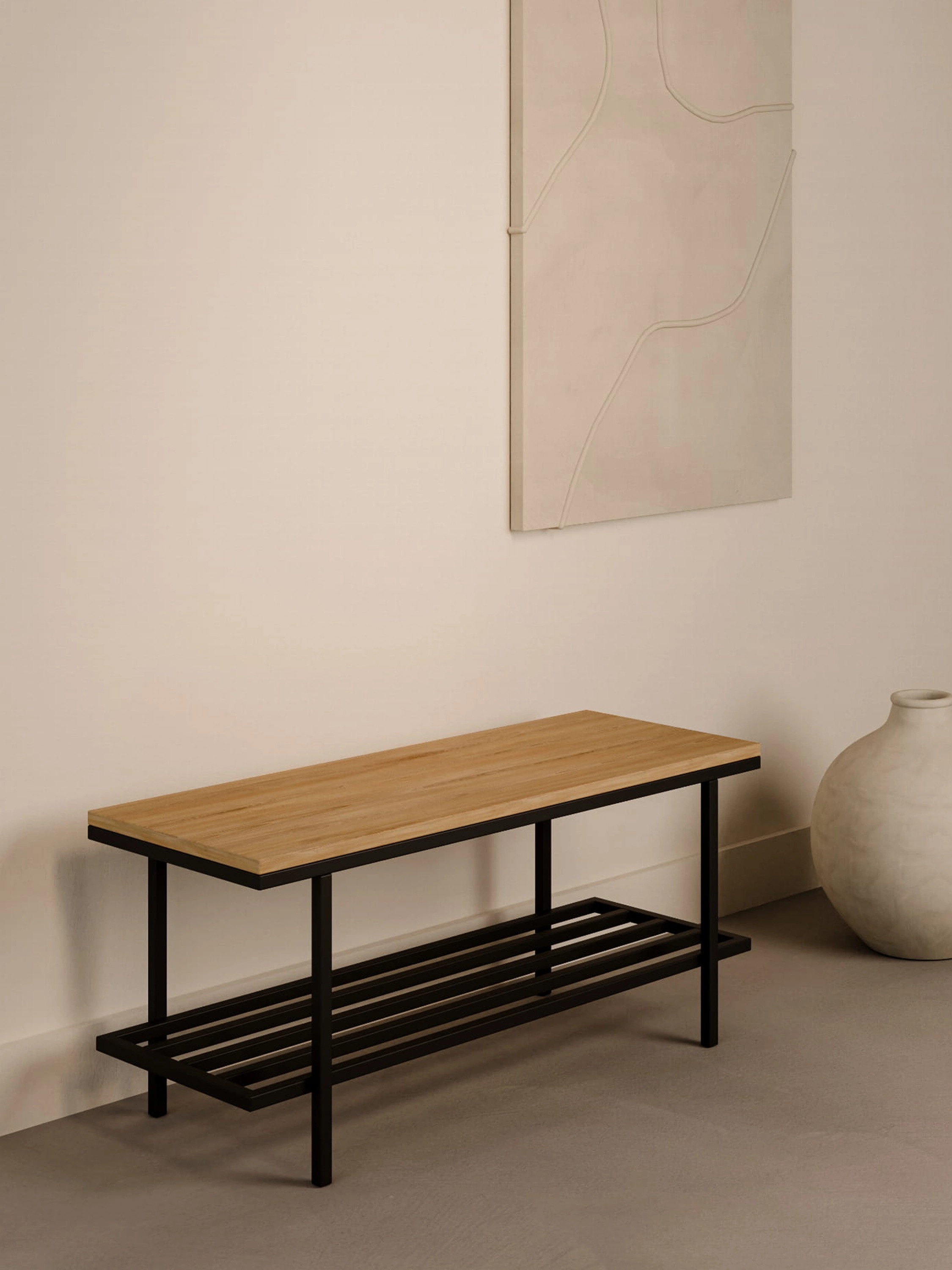 Oak Crest WOOD to industrialna ławka do przedpokoju zaprojektowana z myślą o wnętrzach, w których liczy się autentyczność materiałów i rzemieślnicza jakość wykonania. Minimalistyczna forma łączy naturalne drewno z metalową konstrukcją, tworząc mebel o wyrazistym, a jednocześnie ponadczasowym charakterze.