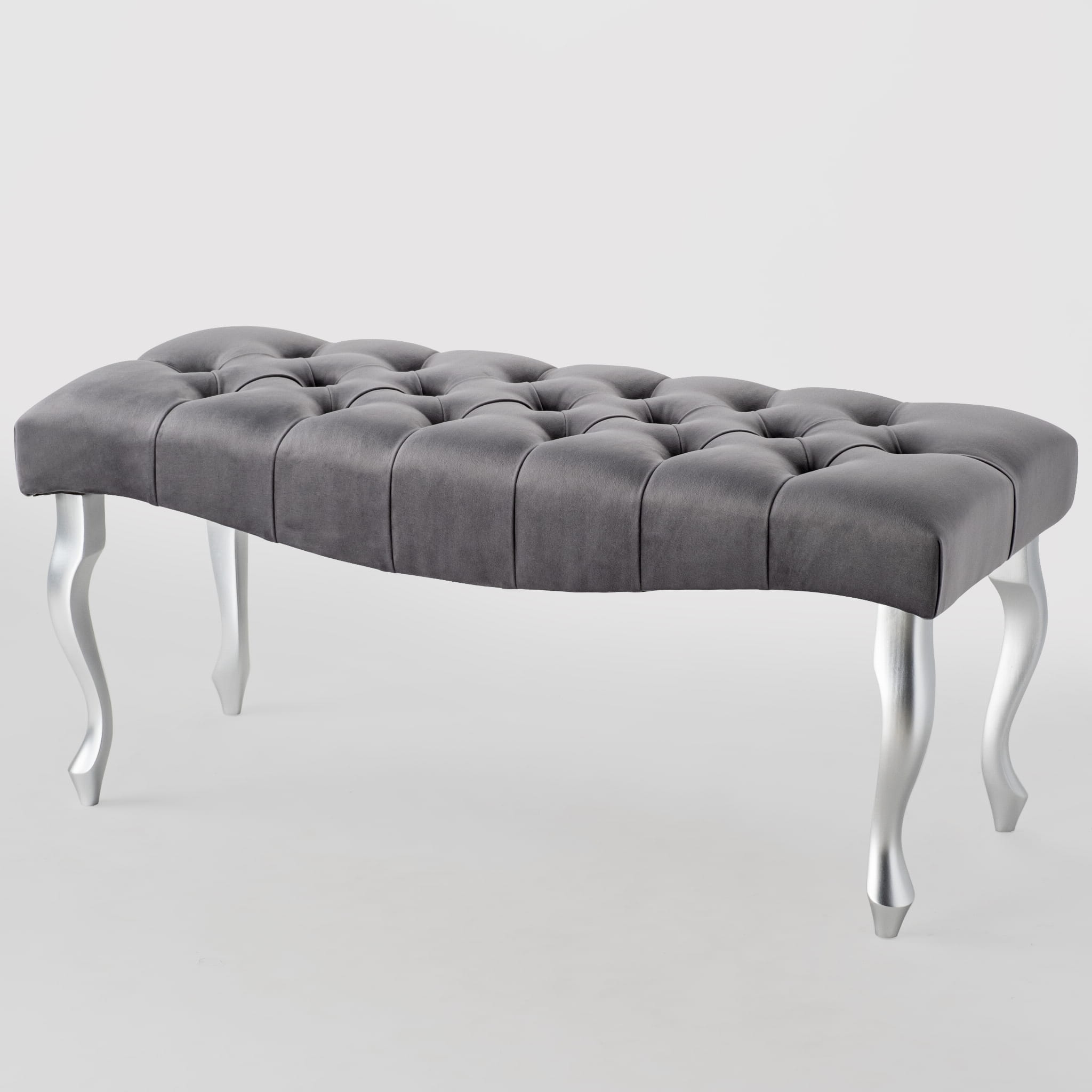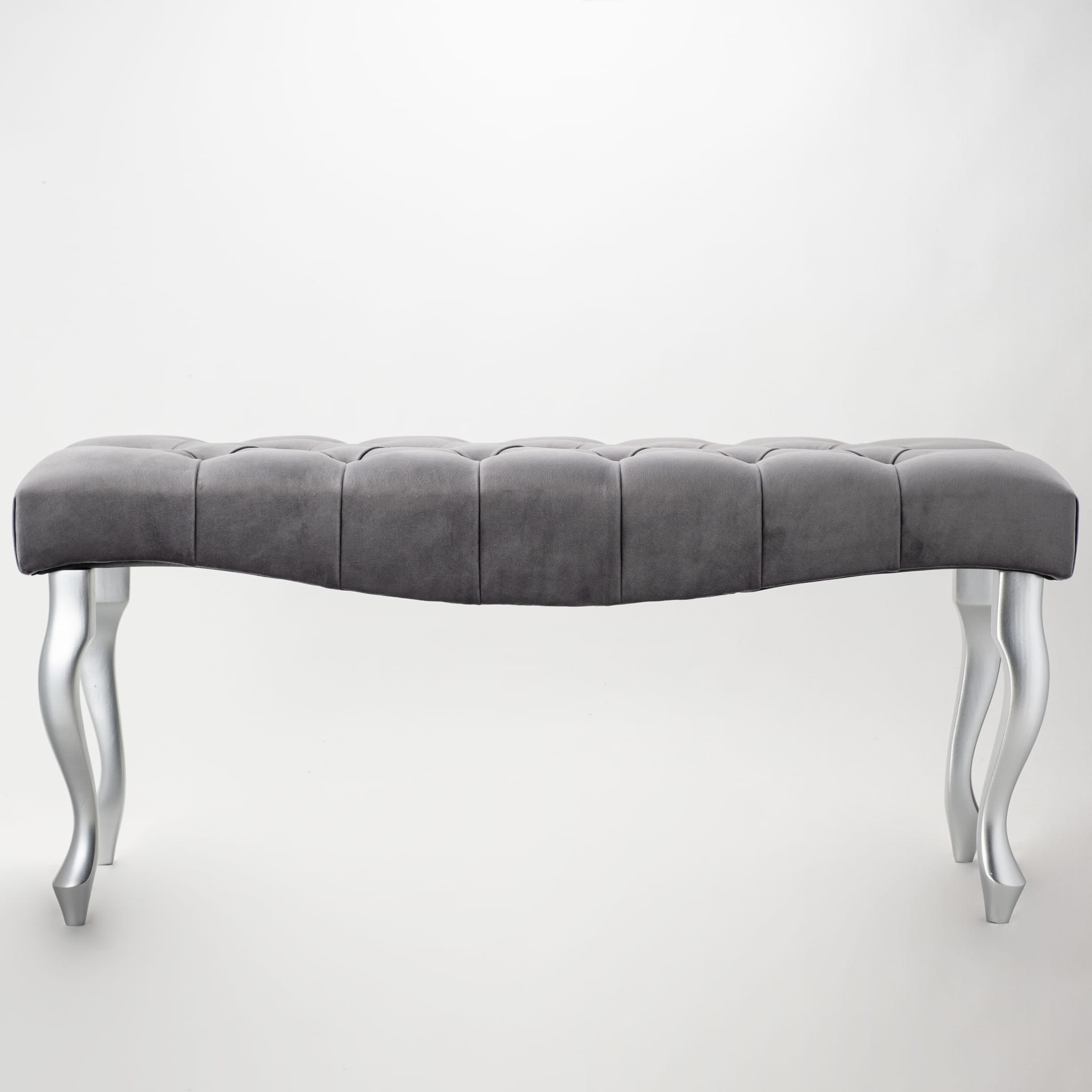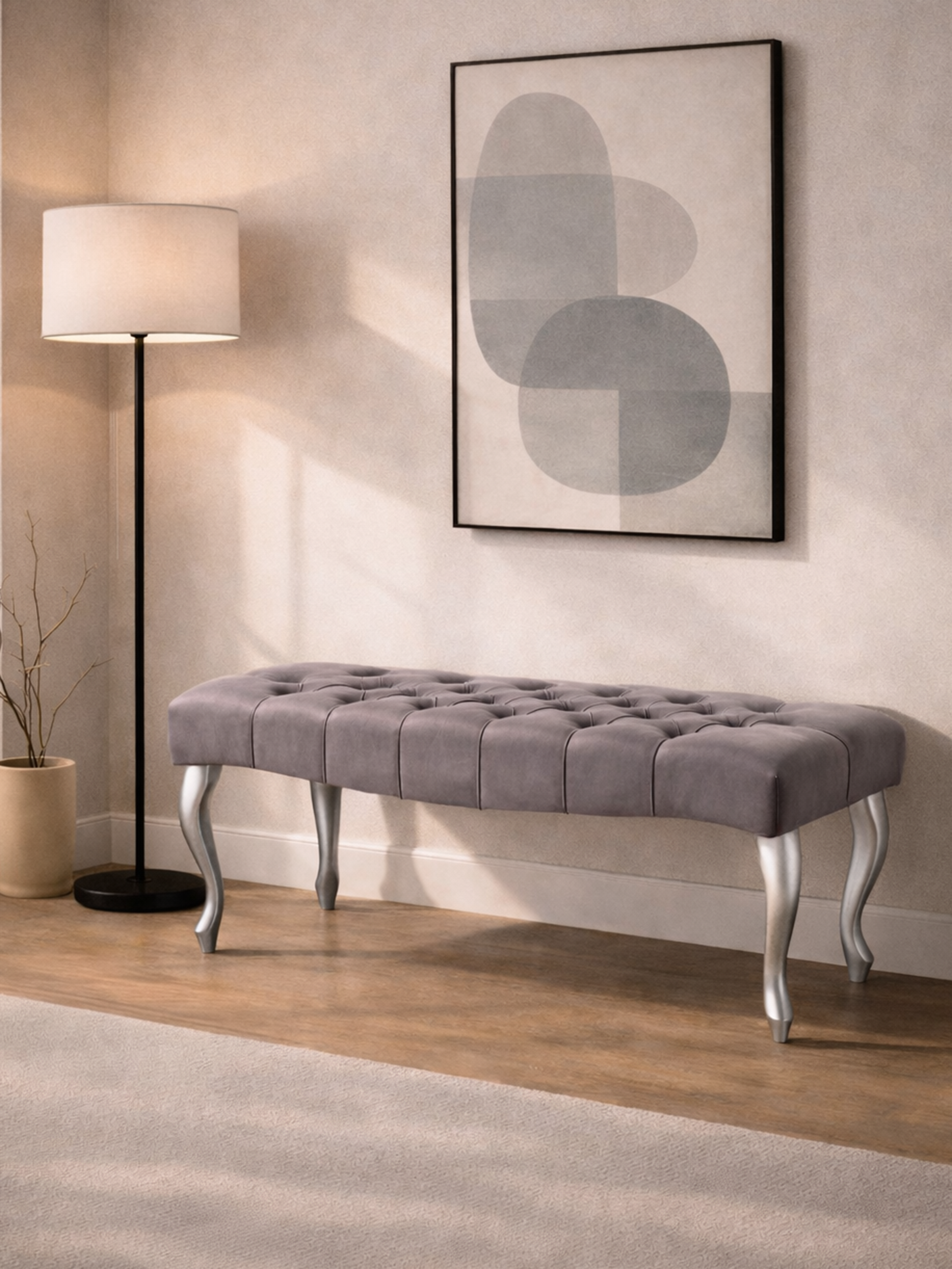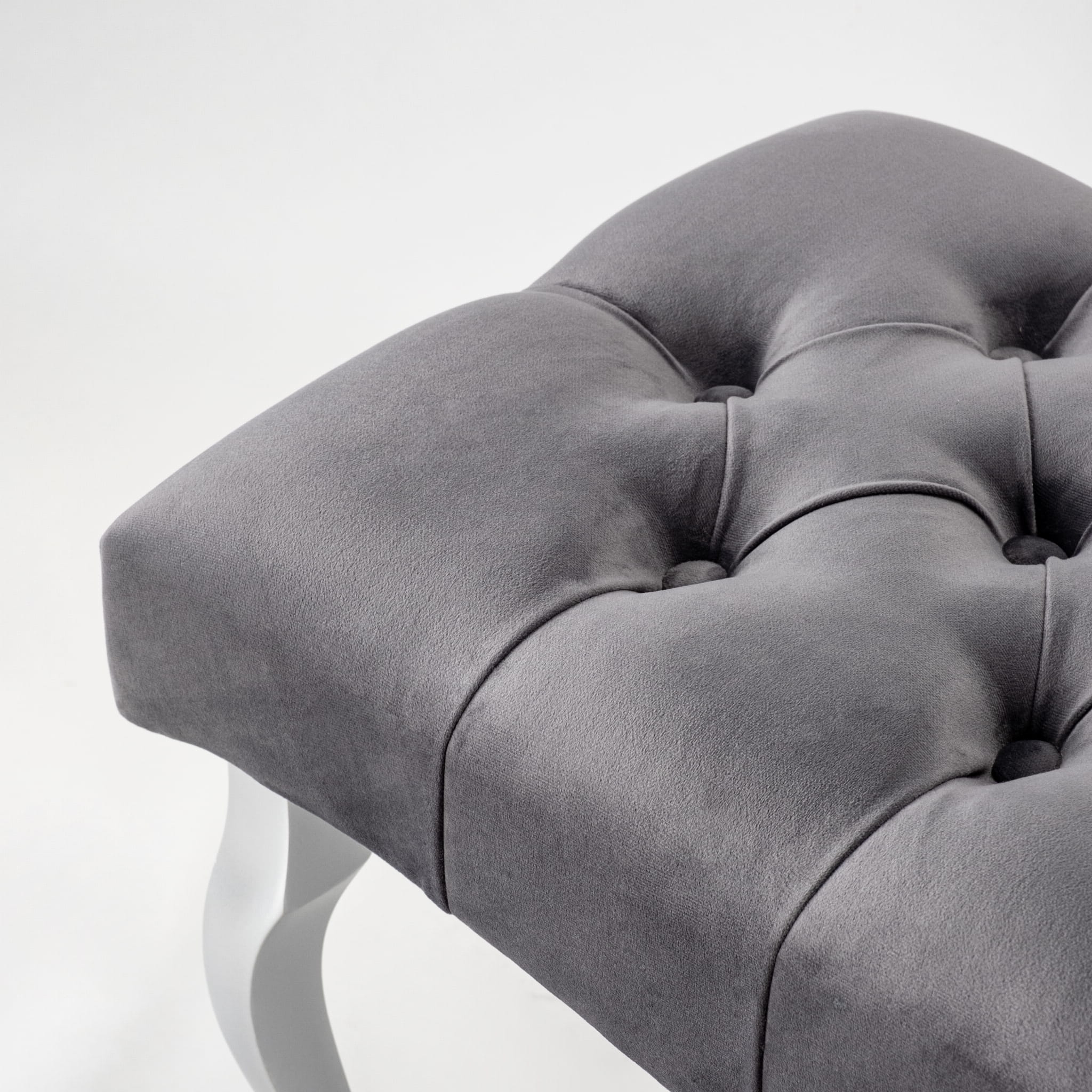 Pikowana ławka Chesterfield Wave to elegancja, która wita już od progu. Jasnoszary welur podkreśla miękkość formy i nadaje ławce lekki, elegancki charakter. Ręcznie tworzona, z charakterystycznym pikowaniem powstaje z myślą o tych, którzy cenią ponadczasowy styl i prawdziwą jakość.
