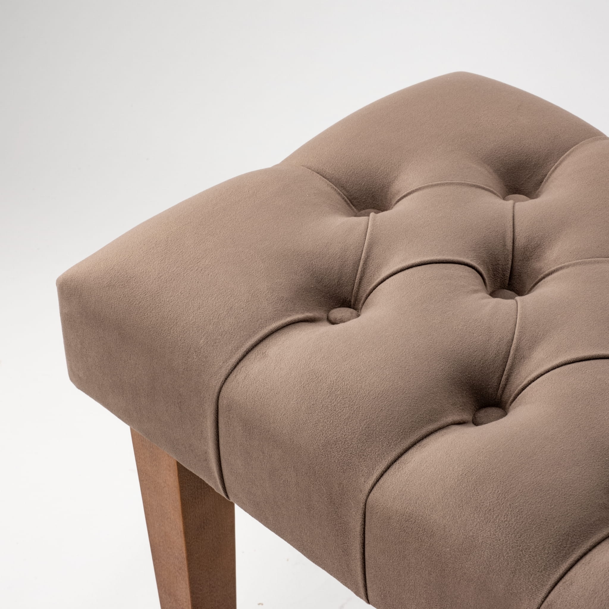 Siedzisko wykonywane jest ręcznie w pracowni rzemieślniczej, dzięki czemu każdy egzemplarz zachowuje dopracowane detale i charakterystyczne pikowanie. Wypełnienie z pianki tapicerskiej zapewnia komfort siedzenia i sprężystość przez długi czas użytkowania.